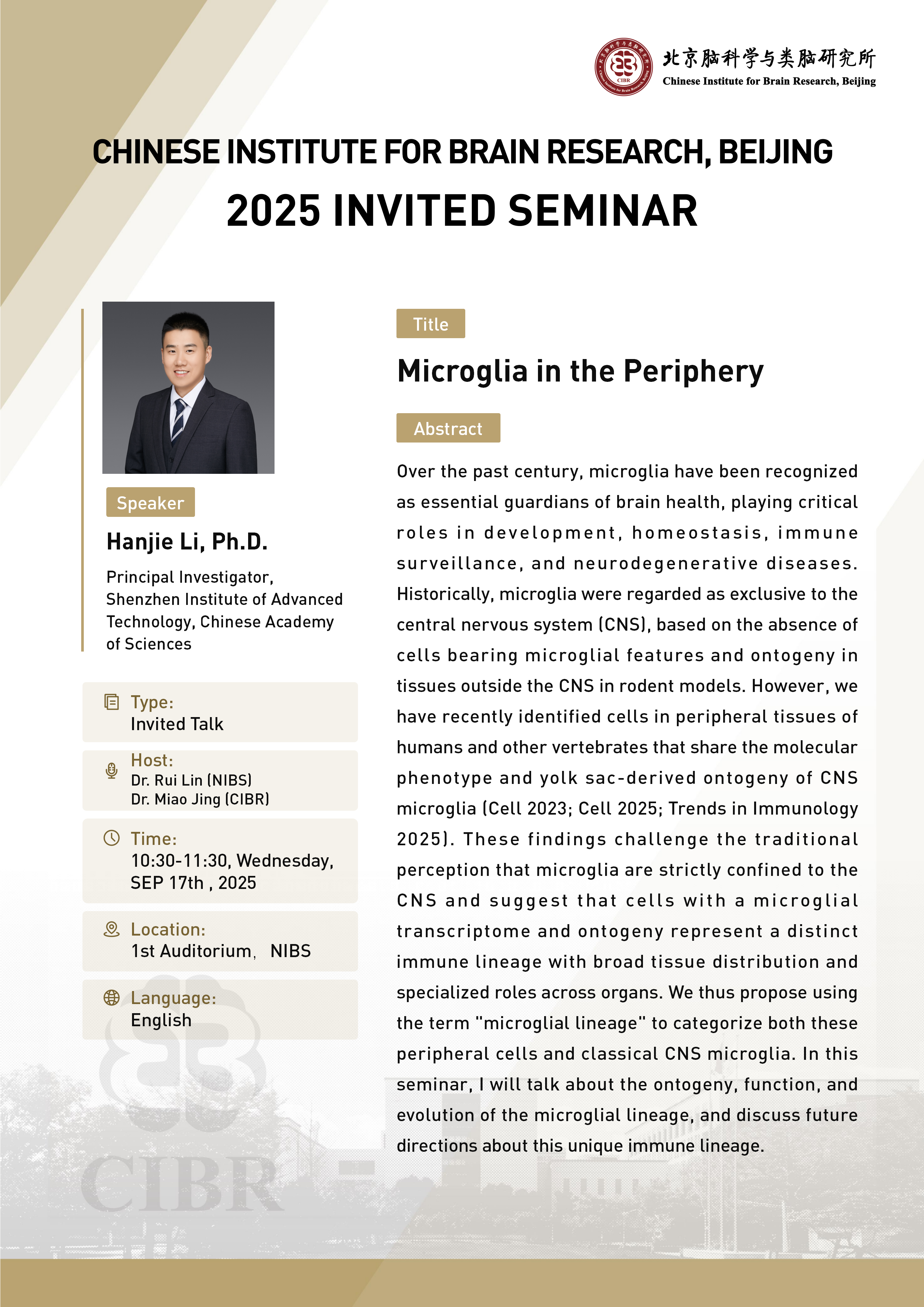 Address Phase I: Chinese Institute for Brain Research, Beijing(CIBR), Jianzan Bldg., No.26, KEXUEYUAN Rd, Zhongguancun Life Science Park, Changping District, Beijing, China Phase II (main offices): Chinese Institute for Brain Research, Beijing(CIBR), Bldg.3, NO.9, YIKE Rd, Zhongguancun Life Science Park, Changping District, Beijing, China Postalcode