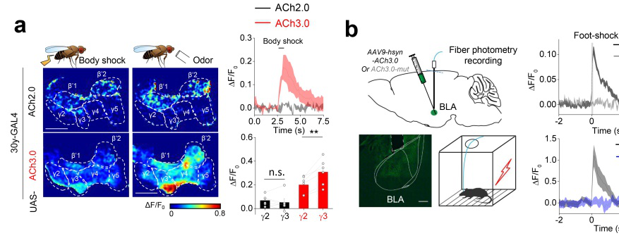 Following in vitro characterization and optimization of ACh3.0, Jing and co-authors applied ACh3.0 in multiple model organisms, demonstrating successful in vivo detection of ACh release and dynamics. In Drosophila, this extremely sensitive ACh3.0 sensor enabled the detection of compartment-specific releases of ACh in the olfactory mushroom body while exposing live flies to various stimuli, thus suggesting that Cholinergic signaling in different regions may have distinct physiological functions. In mice, the ACh3.0 sensor also made it possible to detect ACh dynamics and precise spatiotemporal distribution of ACh during behaviors. The improved ACh3.0 sensor is sufficiently sensitive to track the rapid and transient ACh release evoked by a brief foot-shock stimulation, while also having the stability necessary to report long-term ACh dynamics during full sleep-wake cycles, therefore making it an ideal tool for future and ongoing exploration of ACh function.