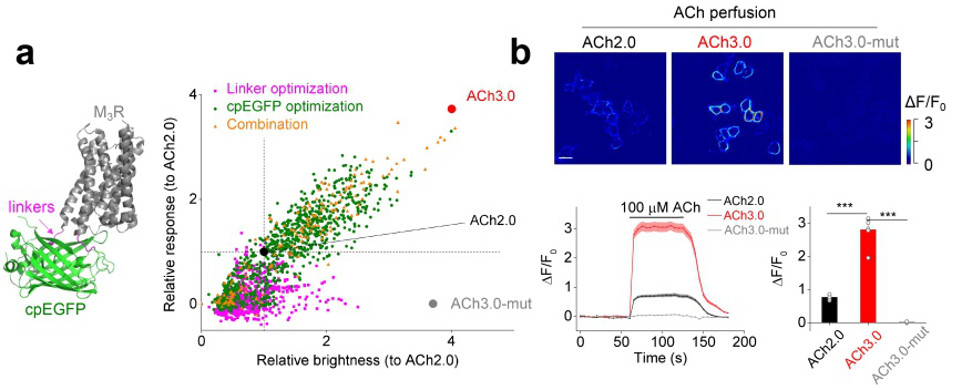 On September 28th, 2020, in close collaboration with Dr. Yulong Li’s lab at Peking University, the Miao Jing Lab at CIBR published a research paper entitled "An Optimized Acetylcholine Sensor for Monitoring In Vivo Cholinergic Activity" in Nature Methods, which reports the development of a next generation ACh sensor and its application in tracking cholinergic signals in various model organisms in vivo. This ACh sensor is engineered to use a G-Protein Coupled Receptor (GPCR) backbone that can convert the conformational change of GPCR induced by ACh binding into a sensitive fluorescent signal through coupling with a circular permutated GFP. In their previous work, an initial version of the ACh sensor was developed that could specifically report ACh dynamics [4]. Based on their success, the team further optimized the ACh sensor performance using site-directed random mutagenesis, resulting in the most recent version (ACh3.0), which exhibited a greater than 3-fold increase in sensitivity. More importantly, through rational engineering, the downstream signal coupling was removed in the new ACh sensor, making it as an isolated ACh detector that does not interfere with cellular physiology. The latest ACh sensor retains the fast response kinetics, physiologically relevant affinity, and precise molecular specificity for ACh detection, making it highly suitable for probing cholinergic signals in vivo.