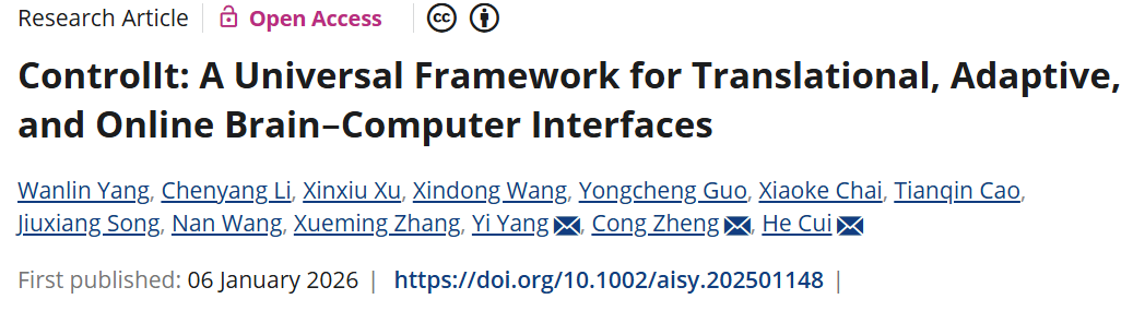 Advanced Intelligent Systems | ControlIt: A Universal Framework for Translational, Adaptive, and Online Brain–Computer Interfaces | He Cui Lab