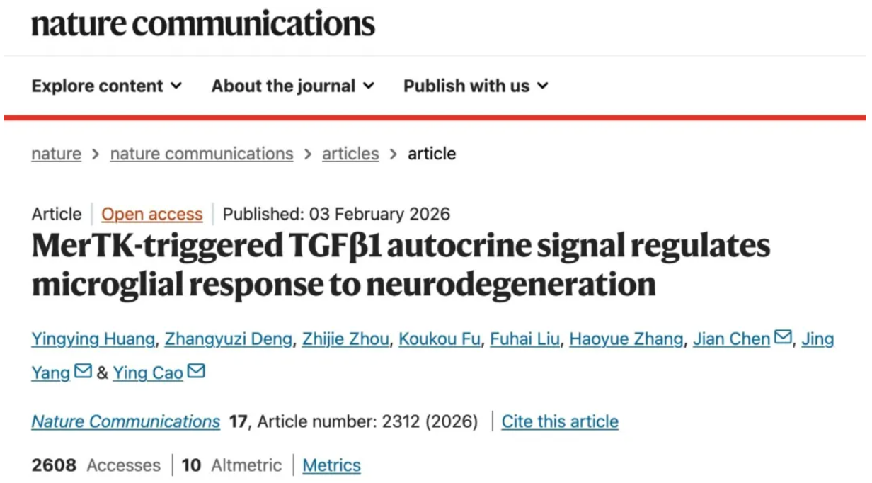 Nat Commun | MerTK-triggered TGFβ1 autocrine signal regulates microglial response to neurodegeneration | Jian Chen Lab