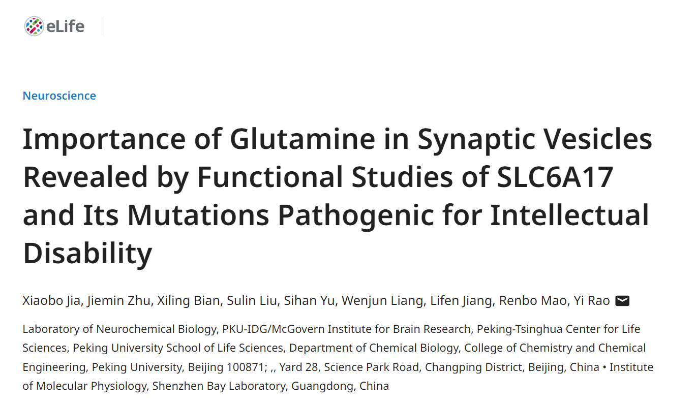 eLife | Importance of Glutamine in Synaptic Vesicles Revealed by Functional Studies of SLC6A17 and Its Mutations Pathogenic for Intellectual Disability | Yi Rao Lab
