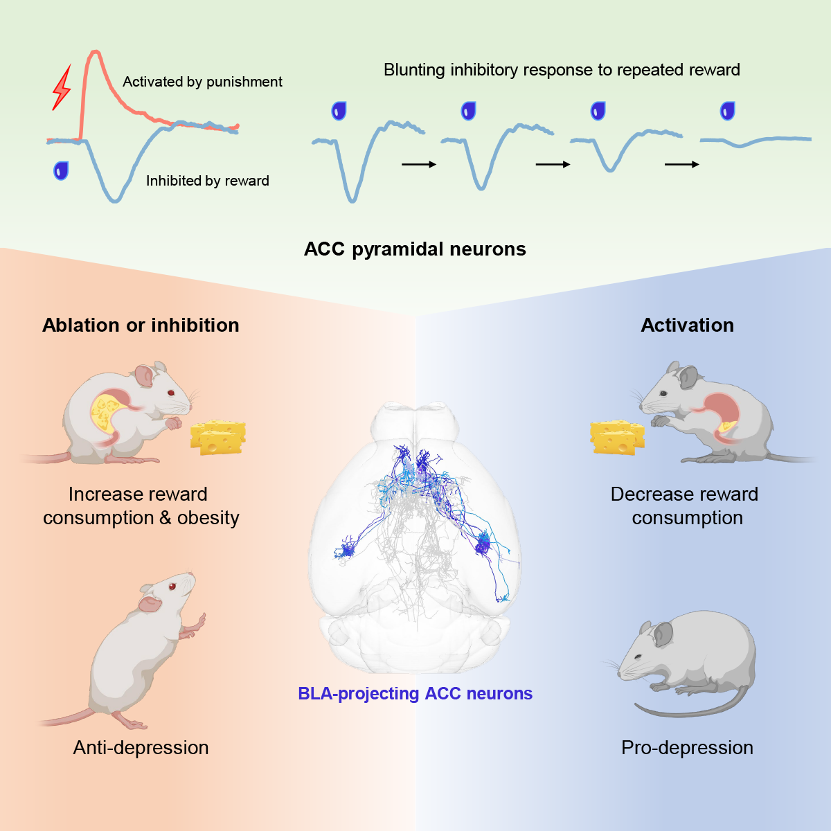 In summary, this study found that the pyramidal neurons in the anterior cingulate cortex, especially the subtype projecting to the basolateral amygdala, can encode and control reward devaluation. Ablating or inhibiting these neurons blunt reward devaluation, causing animals to consume excessive rewards, which can lead to extreme conditions such as obesity or water intoxication. On the other hand, activating these neurons can sensitize reward devaluation, reduce reward intake, and exhibit depressive behaviors. This study differs from common findings that a nucleus can "statically" encode reward or aversion. Instead, it focuses on the anterior cingulate cortex, an important brain cortical area, in the "dynamic" changes of reward value. This discovery helps increase understanding and explanation of depression-like behaviors, including anhedonia, and proposes new treatment strategies for depression and eating disorder-related diseases.