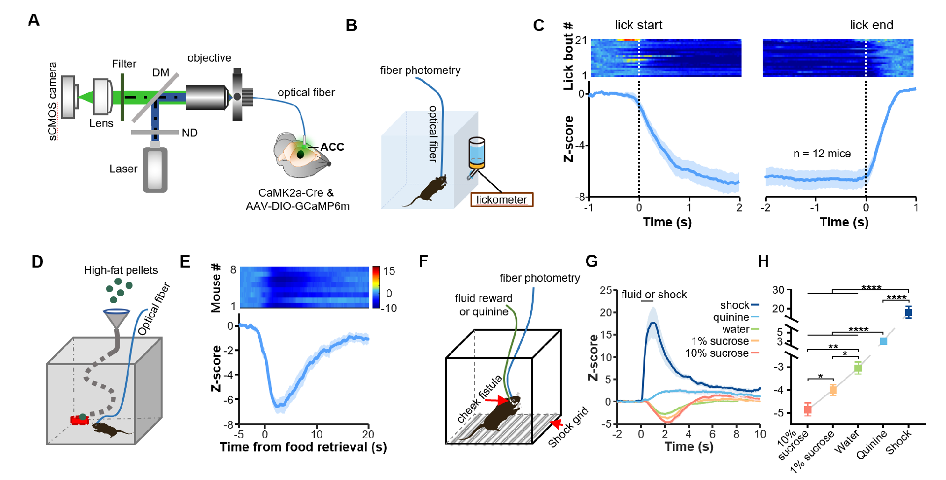 The research team first recorded the responses of pyramidal neurons in the ACC to different rewards and punishments at both the population and single-cell levels using fiber photometry and miniscope imaging (Figure 1). Regardless of whether the mice actively consumed rewards (thirsty mice licking water bottles or hungry mice eating high-fat food) or passively received liquid rewards delivered from cheek fistula, pyramidal neurons in the ACC were significantly inhibited, and the strength of this inhibition was positively correlated with reward value. In contrast, different punishing stimuli (bitter water, electric shocks) activated these neurons. The results of miniscope imaging showed that 41% of pyramidal neurons in the ACC were inhibited by rewards, 21% were activated by rewards, and the rest showed no significant response, indicating an overall inhibitory response to rewards.