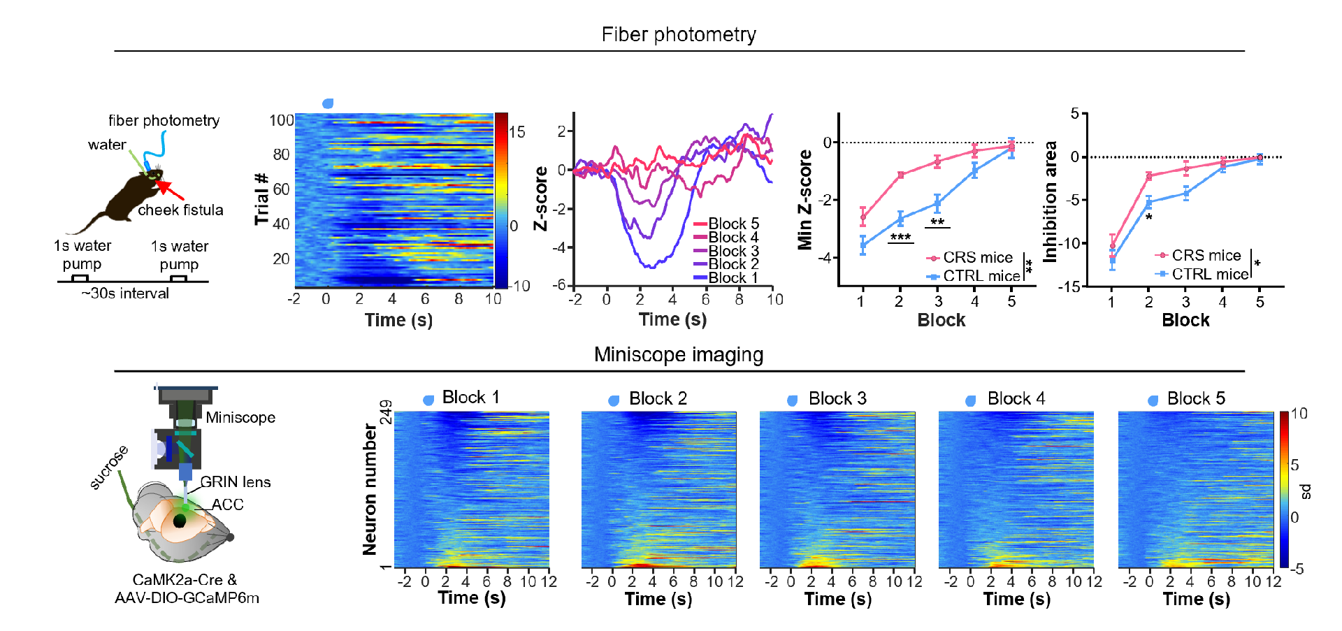 Repeated intake of the same reward leads to its devaluation, and the pleasure it brings gradually decreases. To explore how pyramidal neurons in the ACC encode this dynamic process, the researchers directly pumped water or sugar water rewards into the oral cavities of mice through a cheek fistula, repeating the experiment for 100 trials, and the passive receipt of rewards ensured that the reward amount of each trial was the same (Figure 3). The results of fiber photometry recording showed that at the population level, pyramidal neurons in the ACC were strongly inhibited by rewards at the beginning, and this inhibition gradually weakened with repeated delivery of rewards. By averaging the 100 trials into 5 blocks for statistical analysis, a significant reduction in reward-induced inhibition was observed. At the same time, depression model mice (CRS mice) showed a faster reduction, suggesting that reward devaluation in depressed mice is faster. Two-photon microscopy imaging recordings revealed that at the single-cell level, the number of pyramidal neurons in the ACC inhibited by rewards gradually decreased with repeated delivery of rewards, while the number of neurons activated by rewards did not change significantly.