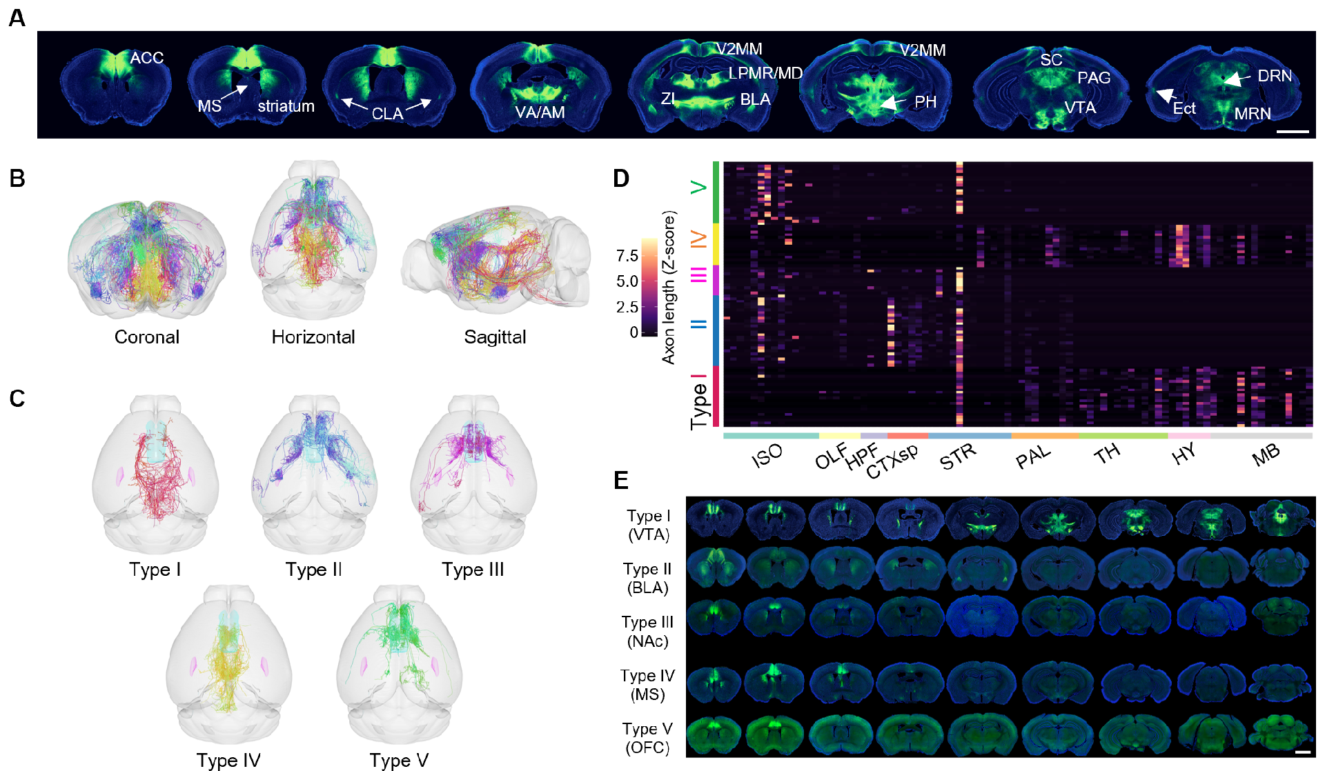 ACC pyramidal neurons project axonal terminals into numerous downstream brain areas. To investigated which ACC projection(s) might function in controlling reward intake and devaluation, researchers reconstructed the complete morphology of individual neurons and identified five distinct subpopulations of ACC neurons that project to the VTA, BLA, NAc, MS, and OFC (Figure 5). Further tracing experiments confirmed that these five subpopulations of neurons have different collateral patterns and specific distributions in cell body locations.