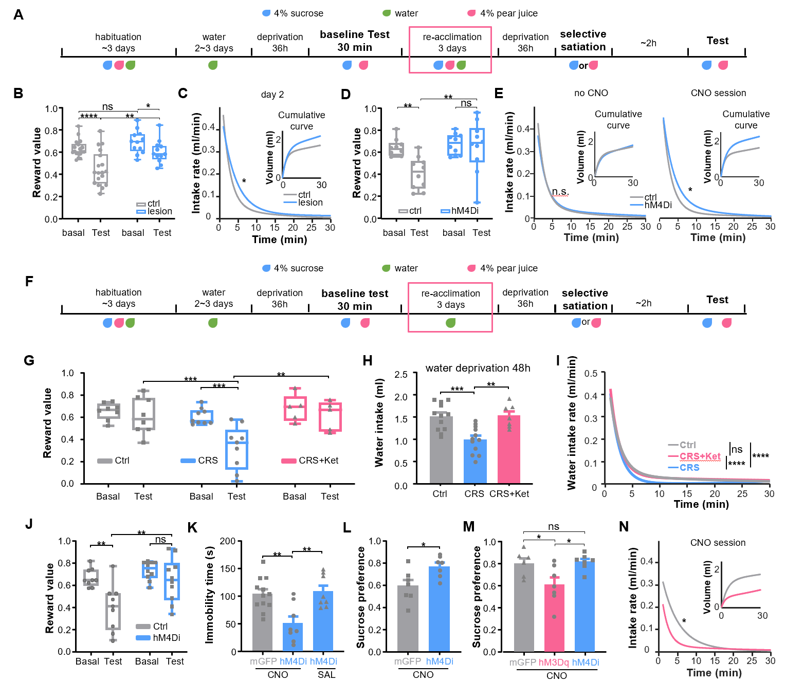 To further explore the relationship between the ACC and reward devaluation, the researchers improved the behavioral paradigm used in other animal models to test reward devaluation (Figure 4). After mice consumed a sufficient amount of a certain reward, they would reduce their preference for that reward and tend to choose another reward. When pyramidal neurons in the ACC were ablated or inhibited, mice did not reduce their preference for the previous reward, indicating that normal activity of pyramidal neurons in the ACC is necessary for reward devaluation. Depression animal models showed hypersensitivity to reward devaluation, and this defect could be alleviated by the fast-acting antidepressant ketamine. Chemogenetic inhibition of pyramidal neurons in the ACC could also alleviate the reward devaluation feature of depression-like animals' hypersensitivity, as well as alleviate depression-like behaviors such as anhedonia and behavioral despair.