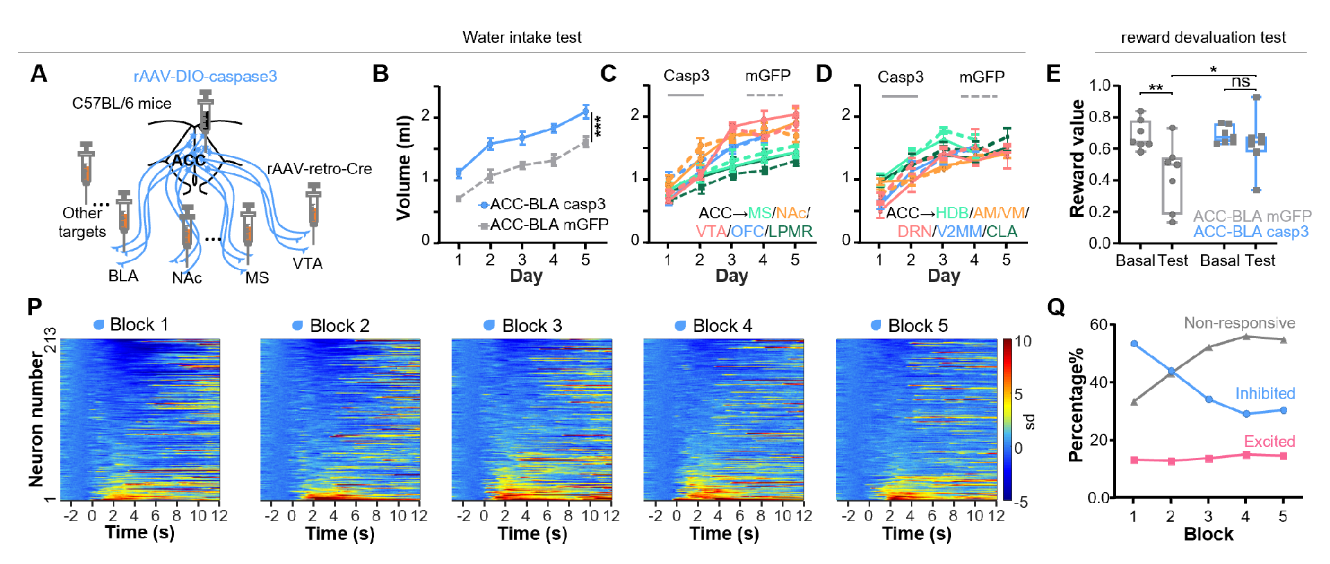 To verify which subpopulations of neurons can control reward devaluation and depression-like behavior, researchers conducted extensive behavioral screening tests (Figure 6). By retrogradely labeling ACC neurons projecting to 11 downstream brain regions, including the five representative brain regions mentioned above, researchers selectively ablated each subpopulation of neurons and conducted water reward intake tests. Only ablating the basolateral amygdala (BLA)-projecting ACC neurons significantly increased reward intake and significantly abolished reward devaluation. Fiber photometry and miniscope imaging also confirmed that this subpopulation of neurons could encode reward devaluation by gradually weakening inhibitory signals. Activation of this subpopulation of neurons sensitized reward devaluation, reduced reward intake, and induced depression-like behavior; while ablating this subpopulation of neurons in depressed animals alleviated depression-like symptoms.