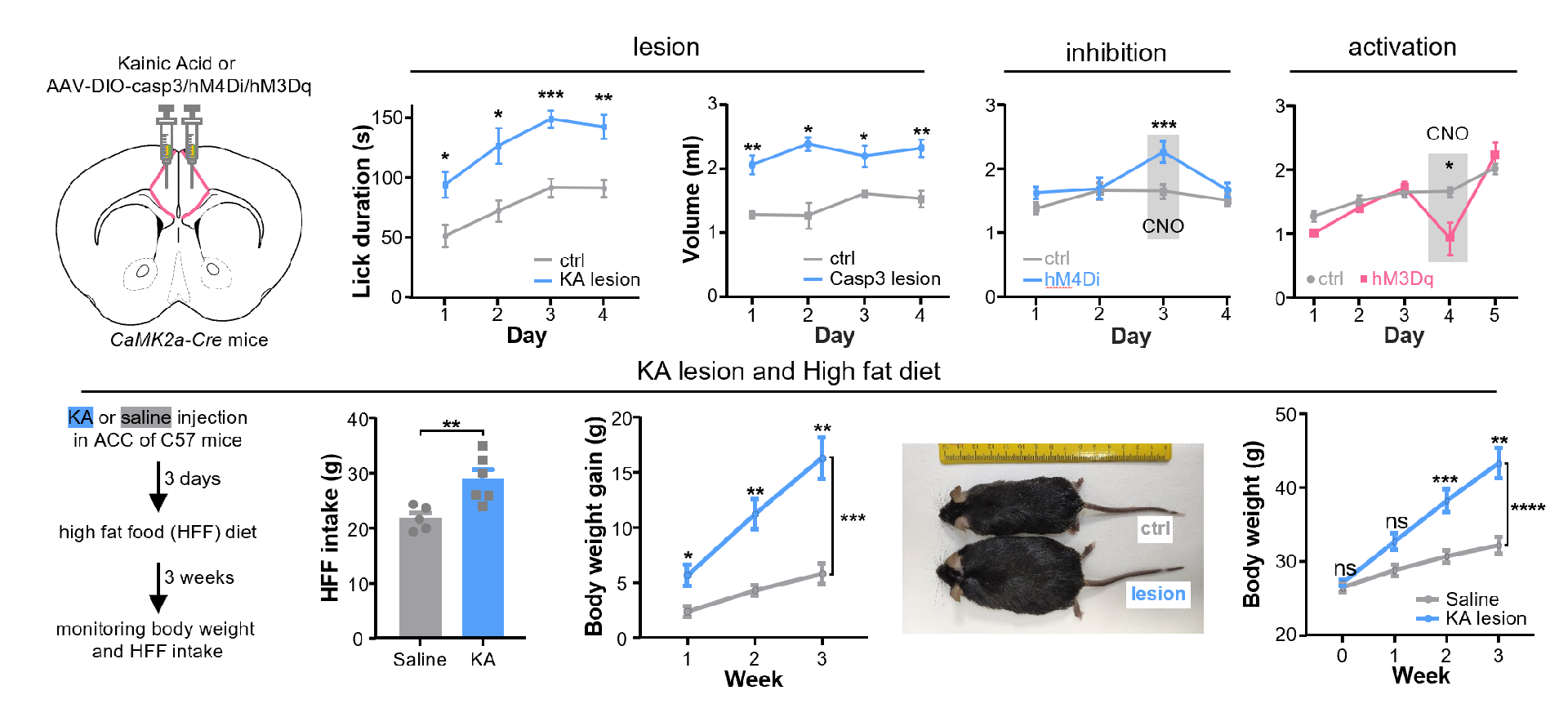 Based on these recorded results, the researchers then investigated whether ablating, inhibiting, or activating these neurons would affect reward intake (Figure 2). In a water reward intake test, thirsty mice were only allowed to access and drink from a water bottle during a 30-minute test period each day, which lasted for 4-5 days. Using kainic acid (KA) excitotoxicity to ablate ACC neurons or inducing apoptosis of pyramidal neurons in the ACC using caspase3 expression, thirsty mice showed excessive water reward intake, and in extreme cases, mice even died because they could not stop drinking water rewards in time. Temporarily reversible inhibition or activation of pyramidal neurons in the ACC using chemogenetics significantly increased or decreased water reward intake, respectively. When high-fat food which is a strong rewarding stimulus was provided to mice for a long time, mice with pyramidal neurons ablation in the ACC consumed more high-fat food and rapidly gained weight, becoming very obese. Interestingly, damaging or inhibiting pyramidal neurons in the ACC only increased reward intake. If the mice were not thirsty, inhibiting pyramidal neurons in the ACC did not prompt them to drink water voluntarily. This also suggests that inhibiting pyramidal neurons in the ACC do not make mice thirsty or directly induce motivation to consume rewards.