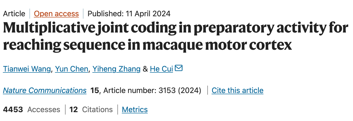 The He Cui Laboratory at the Chinese Institute for Brain Research (CIBR) published a research atricel titled “Multiplicative Joint Coding in Preparatory Activity for Reaching Sequence in Macaque Motor Cortex” in Nature Communications on April 11, 2024. The study reveals that the motor cortex neuron can encode interacive components of movement elements in a sequence during preparation. Regression anaylsis sugguests a transformed coding mechnism from multiplicative coding during motor preparation to additive coding during motor execution. These findings suggest that sequential movement is encoded neither in integrative or independent manner in motor cortex but in different ways in different epochs. This study applied the dynamical systems view at the neural coding level, indicates that the population function changes as temporal evolution. Understanding of the coding mechanism may help building decoders for complex movement and refined BMI system.
