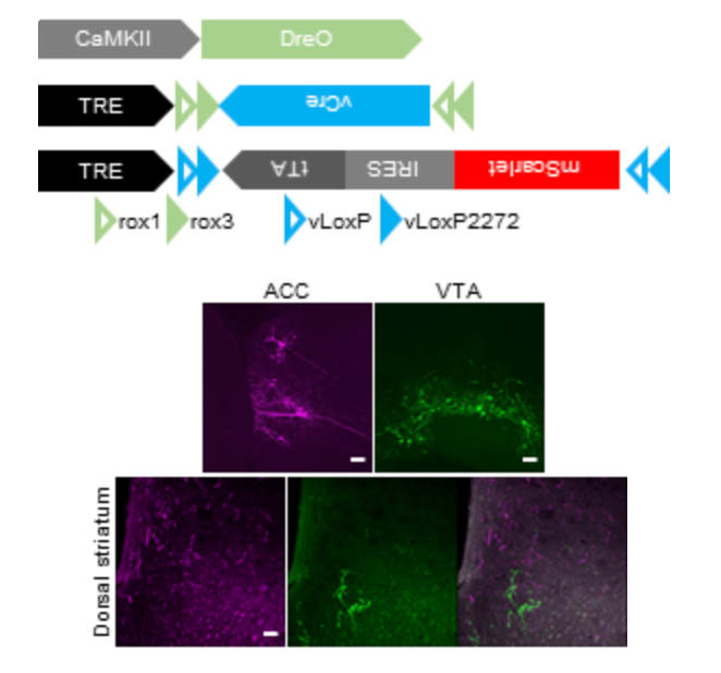 In the initial design of the sparse labeling viruses, the researchers used Cre/FLP as the recombinase pair. Researchers introduced another pair of recombinases DreO/vCre and developed a second version of the sparse labeling system (Fig. 5 left). Multi-color labeling in the same mouse brain was achieved using these two versions of sparse labeling system, which demonstrated the generality of the dual-AAV strategy (Fig. 5 right).