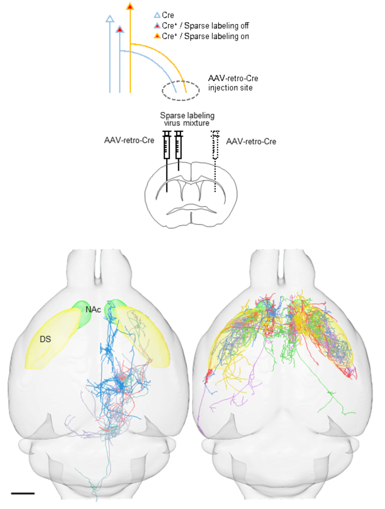 On November 19th, 2018, Dr. Minmin Luo’s laboratory published a paper entitled “Cell type- and Projection-specific Brain-wide Reconstruction of Single Neurons” in Nature Methods. In this study, they described the development of a dual-AAV expression system that enables strong and sparse labeling of individual neurons with cell type- and projection-specificity. By combining with fMOST and other imaging techniques, this system can be used to achieve whole-brain reconstruction of individual neurons.