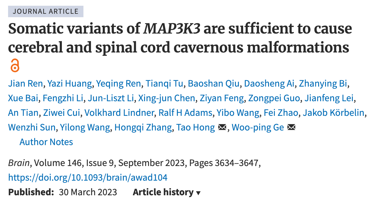 Brain | Somatic variants of MAP3K3 are sufficient to cause cerebral and spinal cord cavernous malformations | Woo-ping Ge Lab