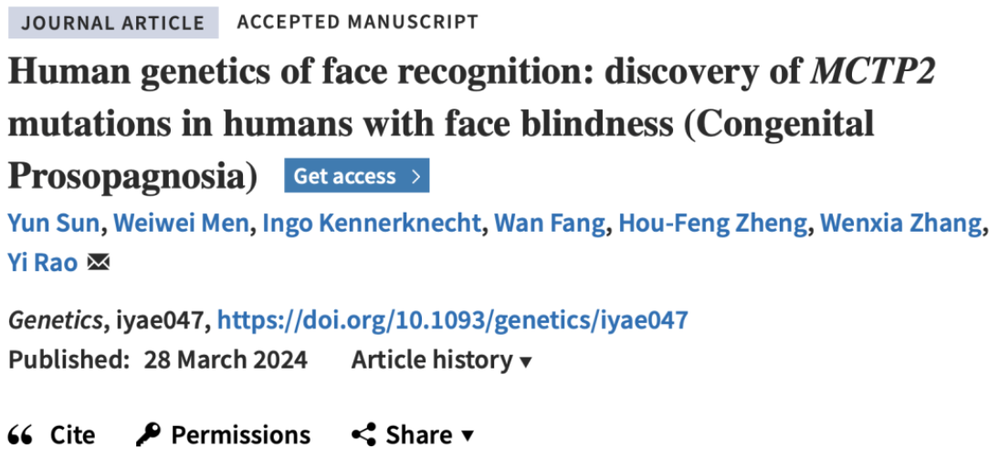 Genetics | Human genetics of face recognition: discovery of MCTP2 mutations in humans with face blindness (Congenital Prosopagnosia) | Yi Rao Lab