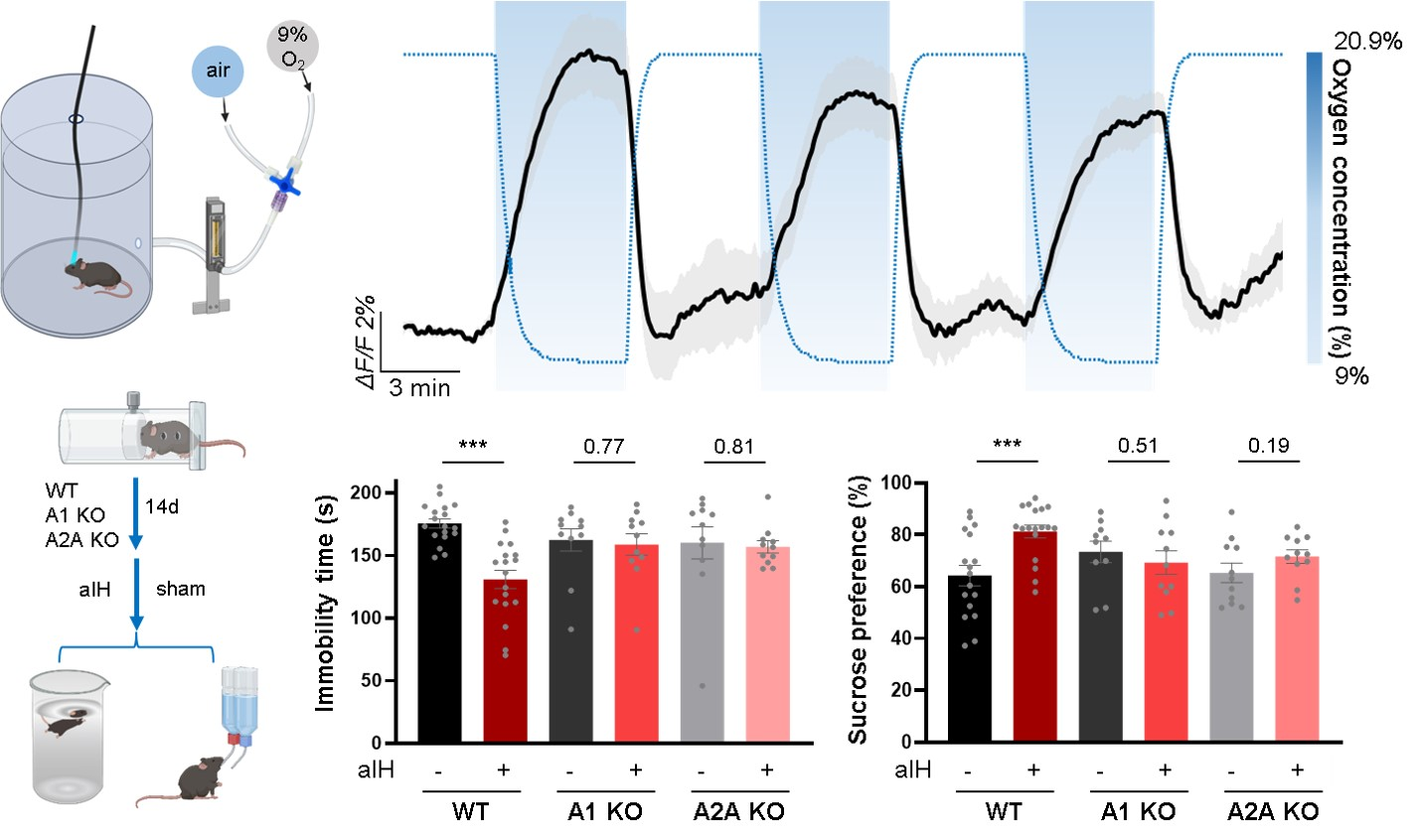 Furthermore, the researchers explored the therapeutic potential of non-pharmacological methods to elevate brain adenosine levels. They found that a controlled acute intermittent hypoxia (aIH) intervention could safely trigger adenosine release in the mPFC and produce rapid antidepressant effects in depressed mice, which were dependent on both A₁ and A₂A receptors.