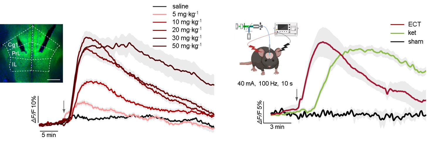 The researchers first used a genetically encoded adenosine sensor (GRABado) combined with fiber photometry to monitor real-time dynamics of extracellular adenosine concentration in specific brain regions of mice. They found that after administering a sub-anesthetic dose of ketamine, a rapid and sustained increase in adenosine levels occurred in the medial prefrontal cortex (mPFC) and hippocampus, but not in the nucleus accumbens. Similarly, ECT also induced comparable adenosine release in the mPFC.