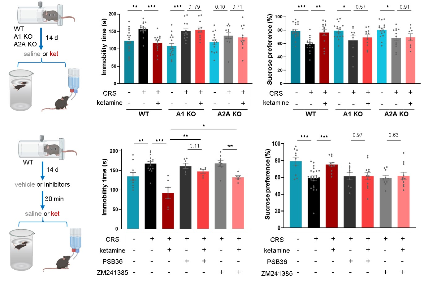 Figure 2: Genetic and pharmacological evidence demonstrates that adenosine signaling mediates the rapid antidepressant phenotype of ketamine.