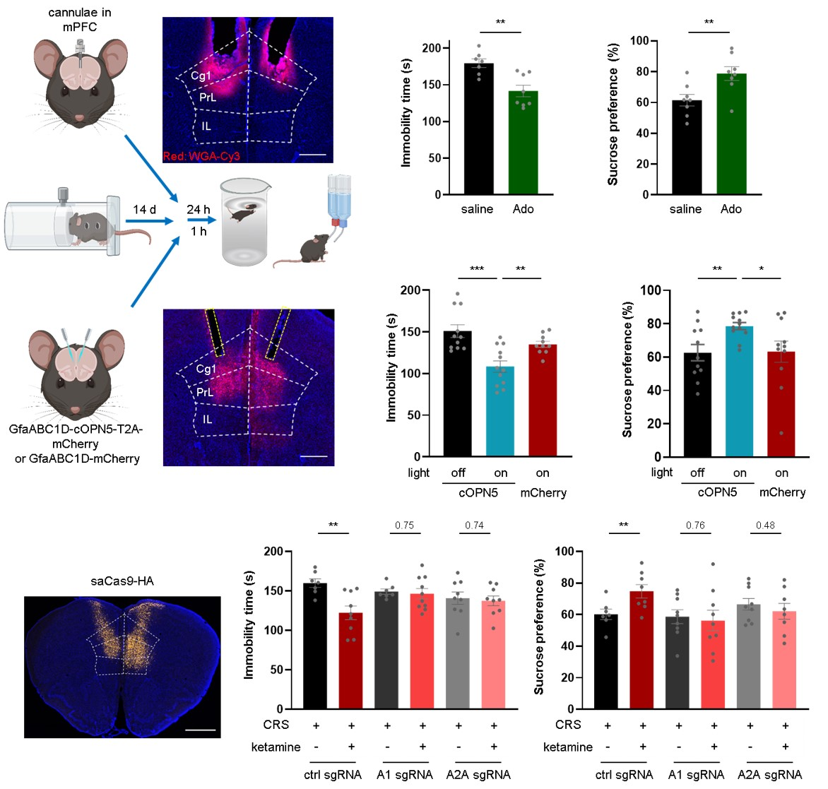 To pinpoint the brain region where adenosine acts, the team conducted functional validation at the circuit level. They found that directly injecting adenosine into the mPFC, or using optogenetics to specifically activate astrocytes in this region to induce endogenous adenosine release, was sufficient to produce rapid antidepressant behavioral effects in depressed mice. Conversely, using AAV-mediated CRISPR/Cas9 technology to specifically knock down A₁ or A₂A receptors in the mPFC blocked the therapeutic effect of systemically administered ketamine. These results collectively indicate that the mPFC is a critical node where adenosine signaling mediates rapid antidepressant action.