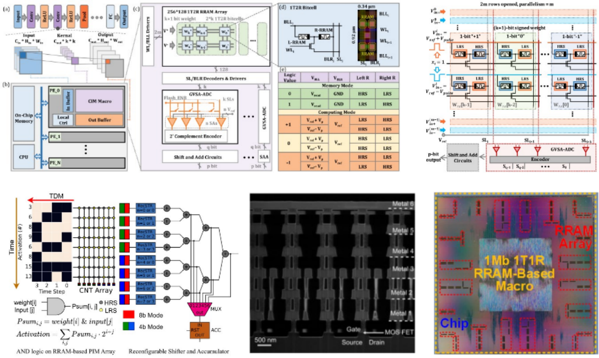 For high-efficiency neural network processing hardware, our group has studied high-performance resistive memory integration technology for in-memory computing, multi-value storage devices, efficient read-write and computing circuits, and system-level chip architecture, focusing on device performance optimization and Key issues in in-memory computing architecture, such as advanced process integration, analog-digital interface circuit design, and software-hardware co-design.