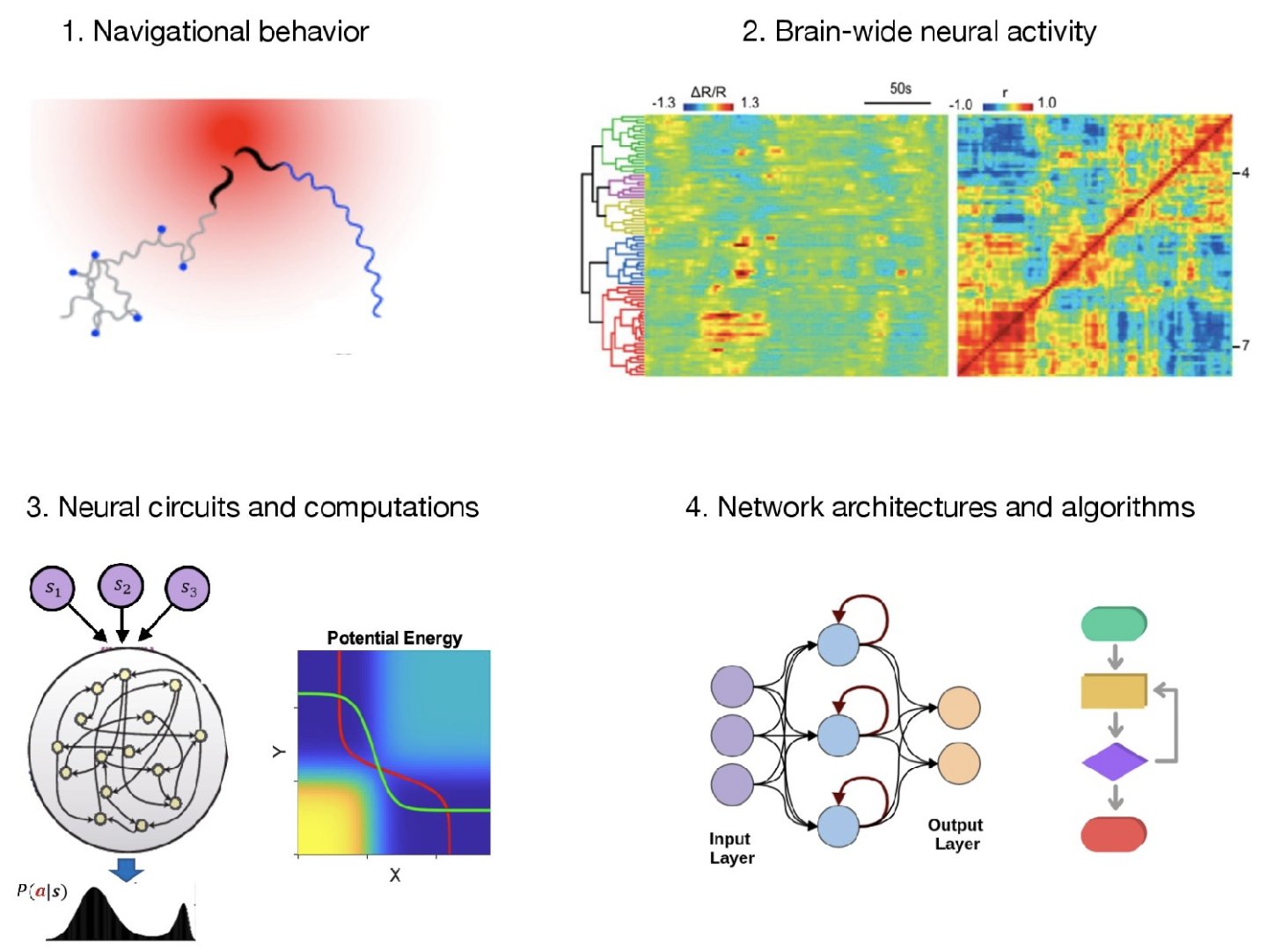 1) Combine quantitative measurements with machine learning and statistical modeling to reveal the computational basis of diverse navigational behaviors;